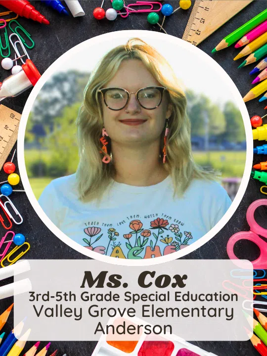 My name is Kyndall Cox, and I am a dedicated educator specializing in 3rd-5th grade cross-categorical special education. Since starting my teaching career in January 2023, I have been passionate about supporting and empowering my students. Growing up, I attended ACSC schools, where I developed a strong connection to the community. This connection deepened through numerous practicums and student teaching experiences within the district. I am now proud to be part of the Valley Grove Elementary School team. Teaching is not just my profession; it is my passion. I find immense joy in watching my students defy the odds and achieve their goals, and I am committed to making a positive impact in their lives every day.